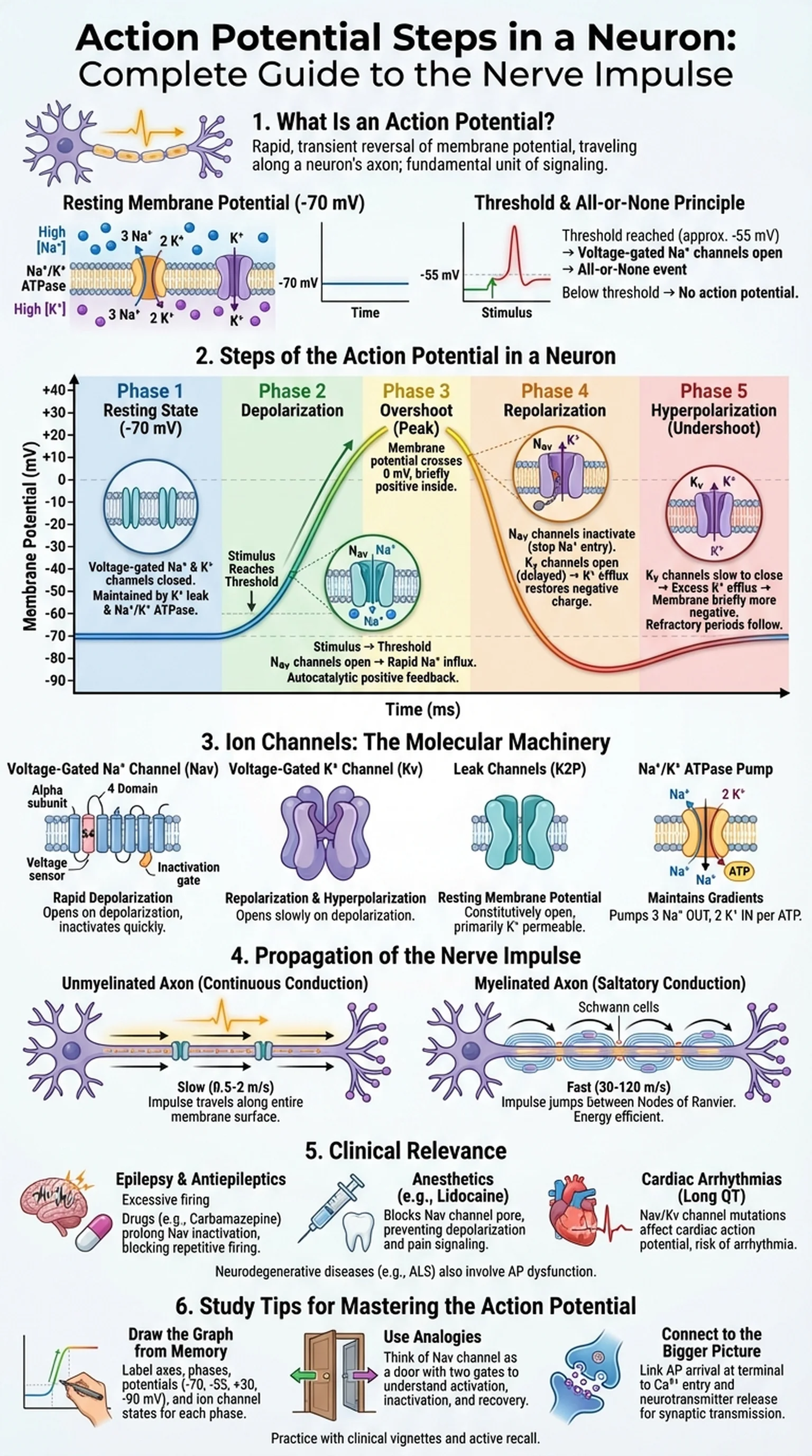 The action potential is the basis of the nerve impulse, the electrical signal that propagates along axons to transmit information between neurons and from neurons to muscles and glands. Each nerve impulse follows an identical sequence of ion channel openings and closings, producing the characteristic spike seen on an oscilloscope or electrophysiology recording. Grasping the action potential steps in a neuron is therefore the gateway to understanding neural communication, synaptic transmission, and the pharmacology of drugs that target ion channels.