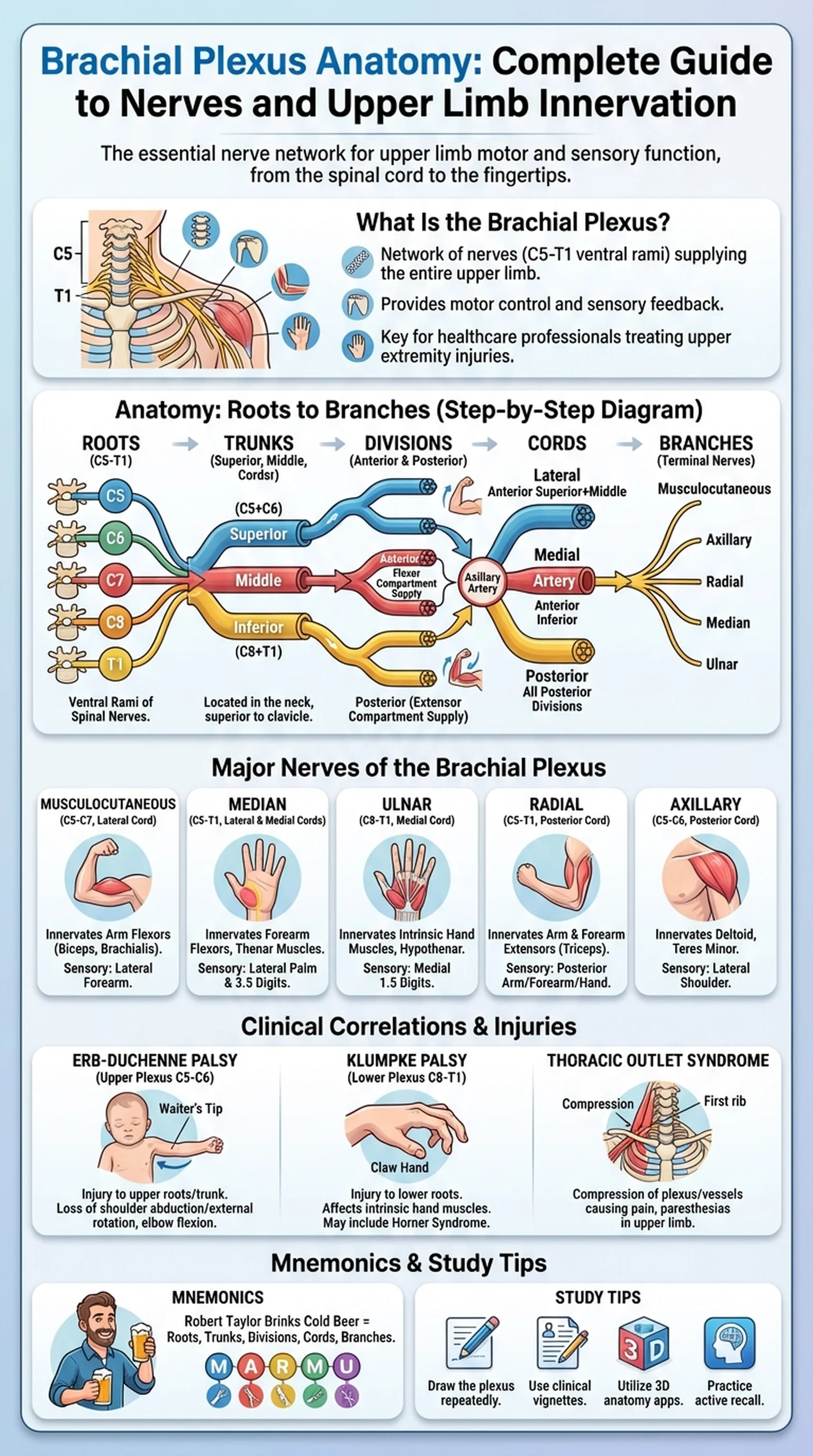 Brachial plexus anatomy is a cornerstone of gross anatomy courses and appears frequently on examinations such as the USMLE, COMLEX, and NBME shelf exams. Clinicians encounter brachial plexus injuries in trauma settings, obstetric complications, and surgical procedures involving the neck and shoulder. A firm grasp of the plexus structure enables accurate localization of nerve lesions based on a patient's motor and sensory deficits. For these reasons, dedicating focused study time to the brachial plexus pays dividends throughout a medical career.