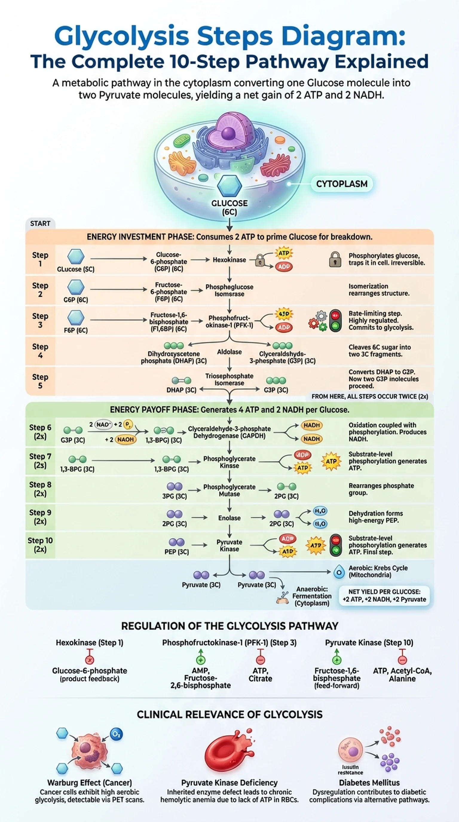 For students of biochemistry and cell biology, understanding the glycolysis steps diagram is a foundational skill. The pathway consists of 10 sequential enzymatic reactions, each catalyzed by a specific enzyme. These reactions can be divided into two phases: the energy investment phase (steps 1 through 5), which consumes ATP, and the energy payoff phase (steps 6 through 10), which generates ATP and NADH. A well-labeled glycolysis steps diagram is an invaluable study tool because it allows you to visualize the flow of carbon, energy, and electrons through the entire glycolysis process at a glance.