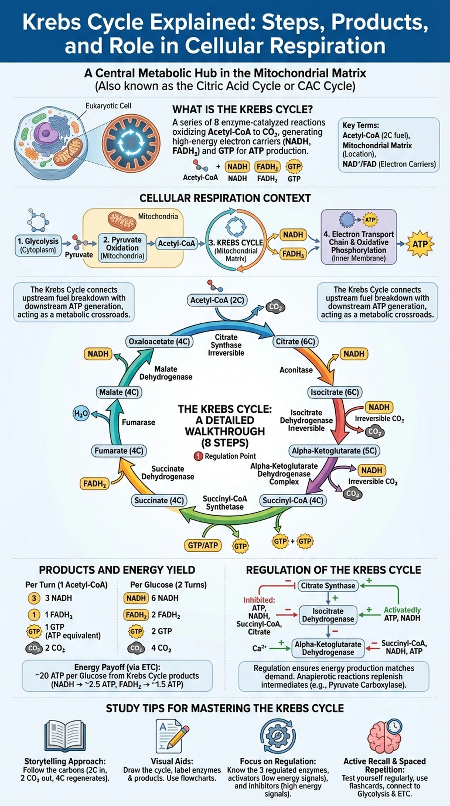 The Krebs cycle is a series of enzyme-catalyzed chemical reactions that form a central part of aerobic metabolism in nearly all living organisms. Named after Sir Hans Krebs, who first described the pathway in 1937, the Krebs cycle takes place in the mitochondrial matrix of eukaryotic cells. It is also widely known as the citric acid cycle because its first intermediate product is citrate, a form of citric acid. In many textbooks, you will also see it abbreviated as the CAC cycle or referred to as the citrate cycle, reflecting the pivotal role that citrate plays in the opening reaction.