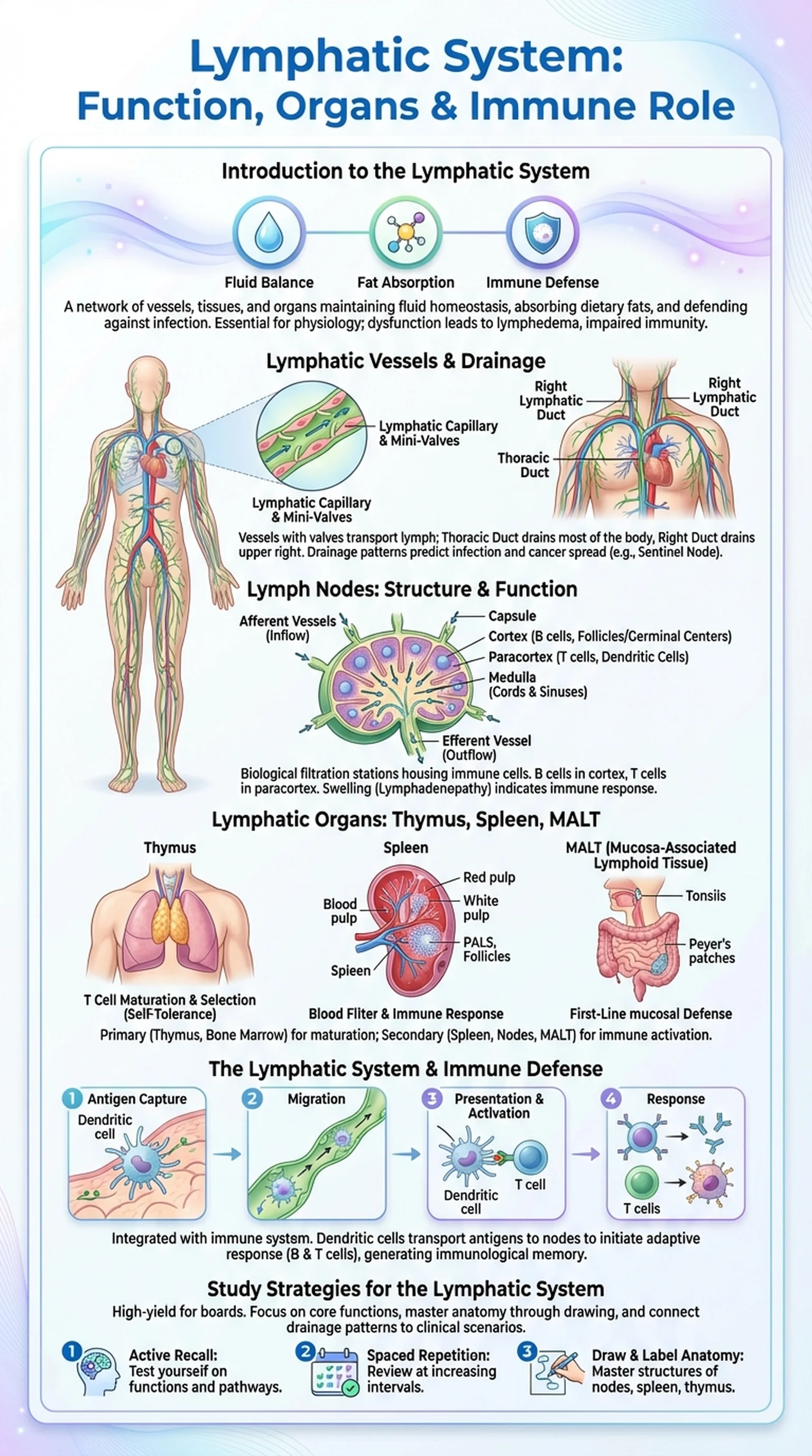 The lymphatic system is a network of vessels, tissues, and organs that works in close partnership with the cardiovascular and immune systems to maintain fluid homeostasis, absorb dietary fats, and defend the body against infection. Despite being less familiar to many students than the circulatory or respiratory systems, the lymphatic system plays an indispensable role in human physiology. Without a functioning lymphatic system, tissues would become waterlogged with interstitial fluid, dietary lipids could not be properly absorbed, and the body's immune surveillance would be critically impaired.