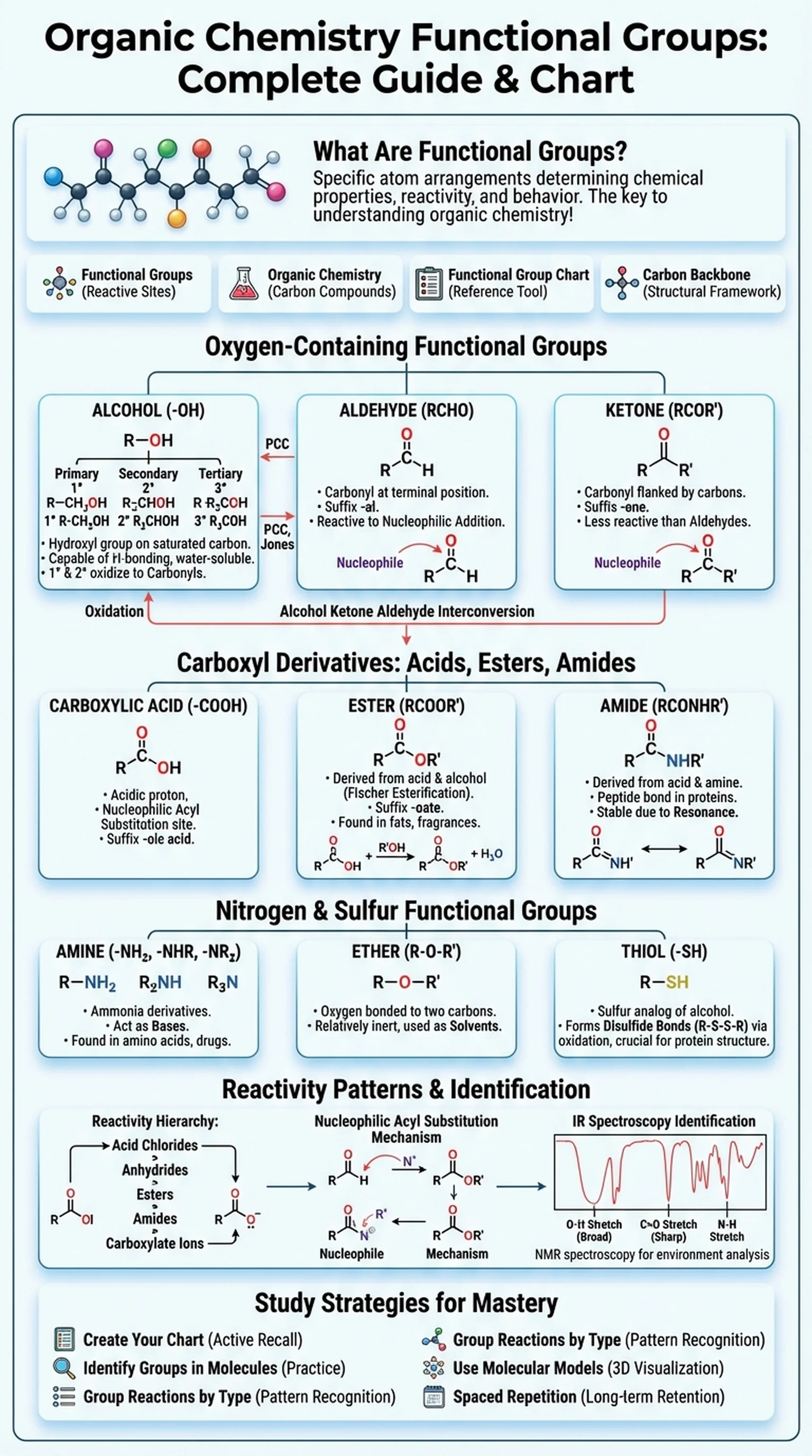Functional groups are specific arrangements of atoms within organic molecules that determine the chemical properties, reactivity, and behavior of the compound. In organic chemistry, the carbon backbone of a molecule provides its structural framework, but it is the functional groups attached to that backbone that dictate how the molecule will react with other substances. Mastering functional groups is therefore the single most important step in understanding organic chemistry as a whole.