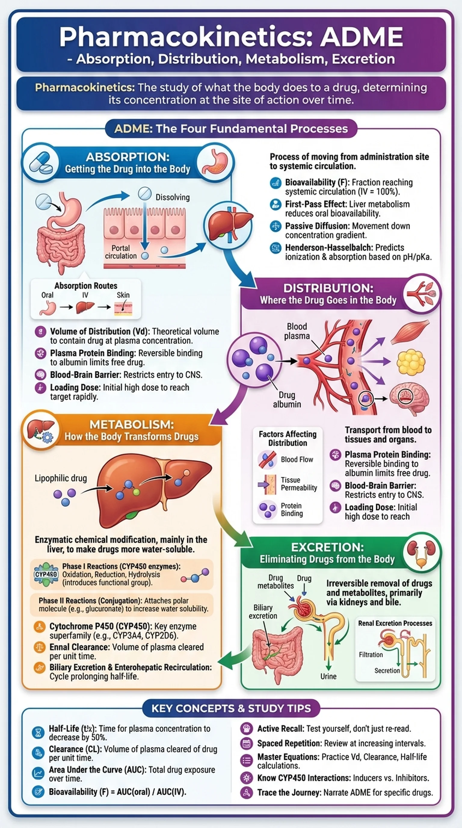Pharmacology students, medical students, and pharmacy students encounter pharmacokinetics as one of the most quantitative and clinically relevant subjects in their training. It appears heavily on licensing examinations including the USMLE, NAPLEX, and MCAT. The mathematical relationships that govern drug concentration over time, including concepts such as half-life, volume of distribution, clearance, and bioavailability, form the quantitative backbone of ADME and allow clinicians to predict how drugs will behave in individual patients with varying organ function, body composition, and genetic backgrounds.