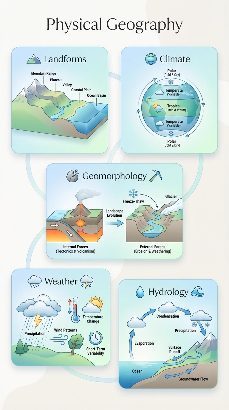 Physical Geography is an essential course in Geography that builds foundational knowledge and skills. This infographic provides a comprehensive visual overview of the course material, perfect for exam preparation and quick reference.