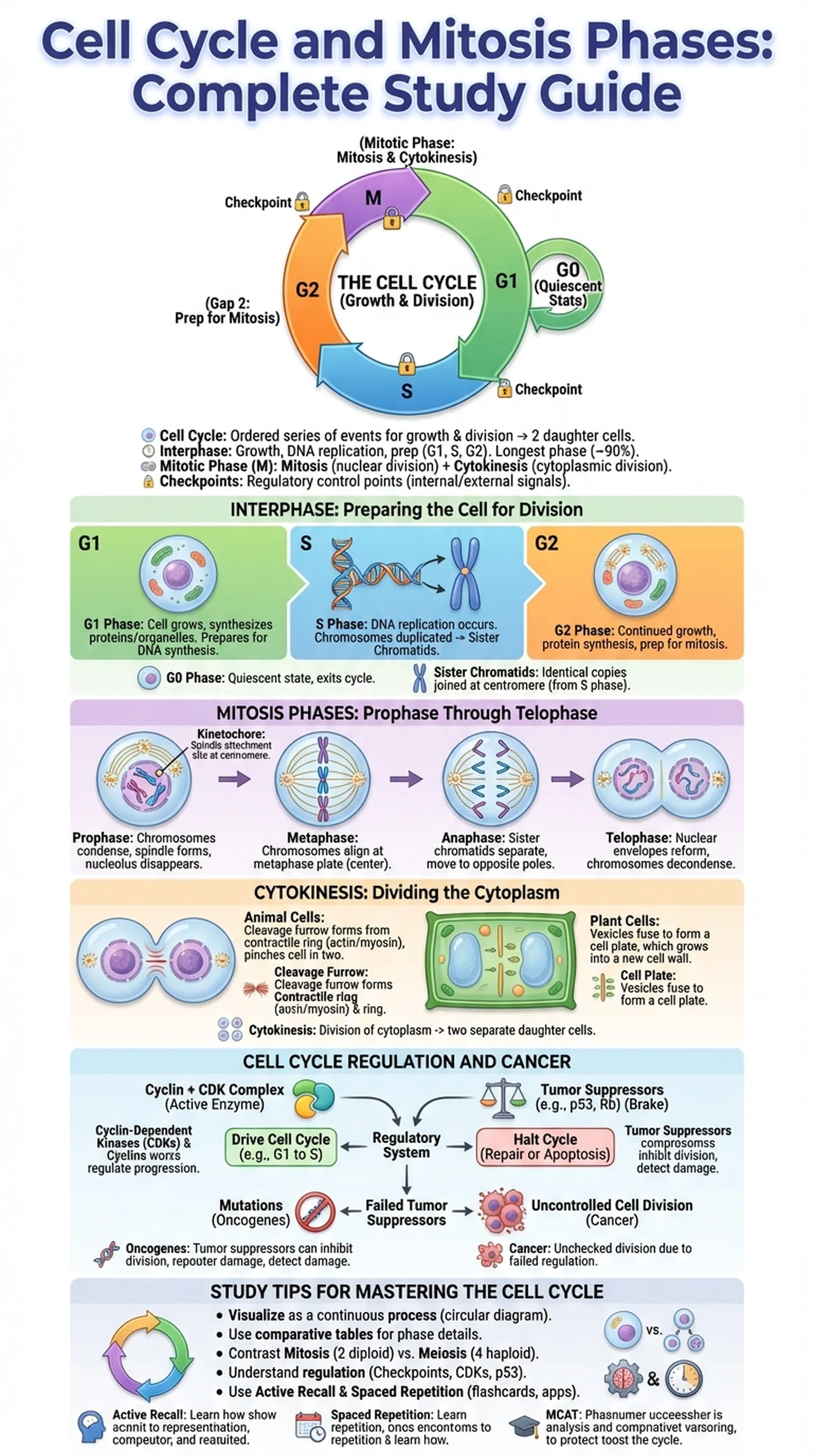 The mitotic phase encompasses both mitosis, the division of the nucleus, and cytokinesis, the division of the cytoplasm. Together, these processes produce two genetically identical daughter cells. The cell cycle is tightly regulated by a system of checkpoints and regulatory proteins, including cyclins and cyclin-dependent kinases, that monitor cell size, DNA integrity, and external growth signals. When these regulatory mechanisms fail, the result can be uncontrolled cell division, a hallmark of cancer. Mastering the stages of the cell cycle provides a critical foundation for understanding how organisms develop and how diseases related to cell division arise.