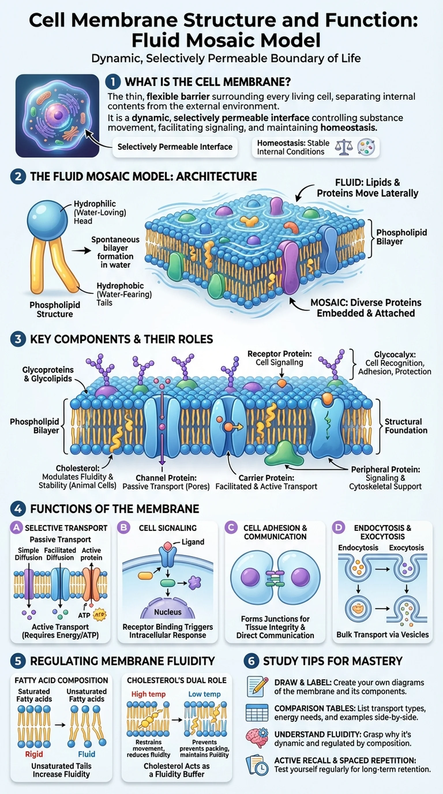The cell membrane is composed primarily of lipids, proteins, and carbohydrates arranged in a specific architecture described by the fluid mosaic model. This model, proposed by Singer and Nicolson in 1972, describes the membrane as a two-dimensional fluid in which lipid and protein molecules diffuse laterally. The term "mosaic" refers to the diverse collection of proteins embedded within and attached to the lipid layer, creating a patchwork of molecular components with specialized functions.