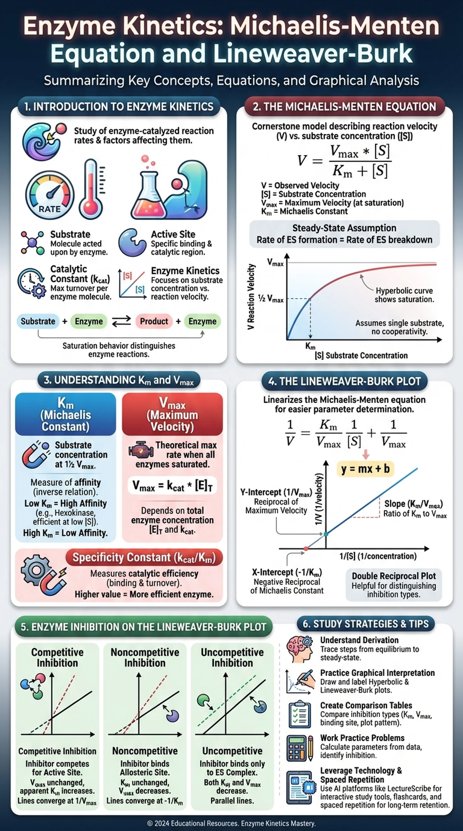 The study of enzyme kinetics also reveals how enzymes achieve their remarkable catalytic power. Enzymes lower the activation energy of reactions by stabilizing the transition state, and kinetic measurements allow scientists to quantify this effect. Parameters such as the catalytic constant (kcat), the Michaelis constant (Km), and the maximum velocity (Vmax) are all derived from kinetic experiments. Together, these values describe an enzyme's efficiency, its affinity for substrate, and the upper limit of its catalytic output. Understanding these parameters is essential for students preparing for the MCAT, USMLE, or any advanced biochemistry coursework.
