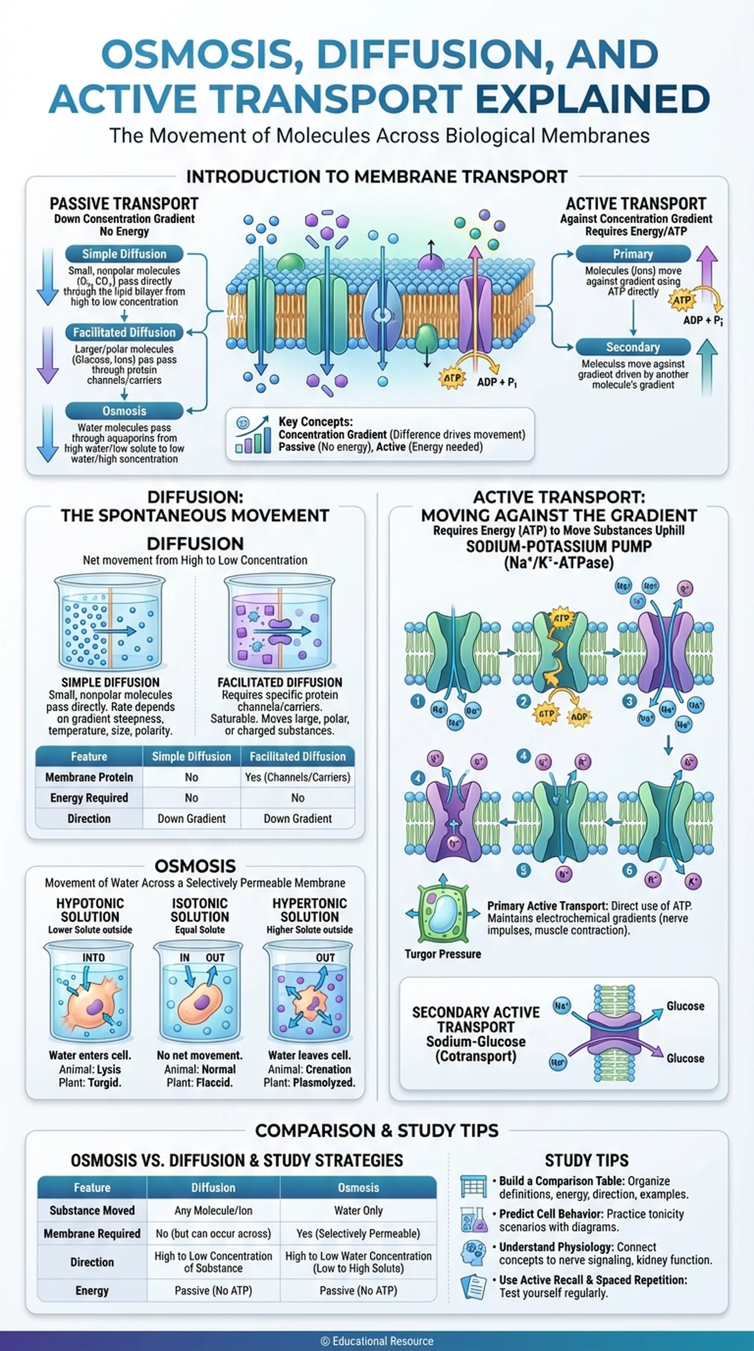 Membrane transport mechanisms are broadly classified into two categories: passive transport and active transport. Passive transport includes simple diffusion, facilitated diffusion, and osmosis, all of which move substances down their concentration gradient without requiring cellular energy. Active transport, by contrast, moves substances against their concentration gradient and requires energy, typically in the form of ATP. This fundamental distinction between energy-independent and energy-dependent movement is the organizing principle for understanding how cells regulate their internal environment.