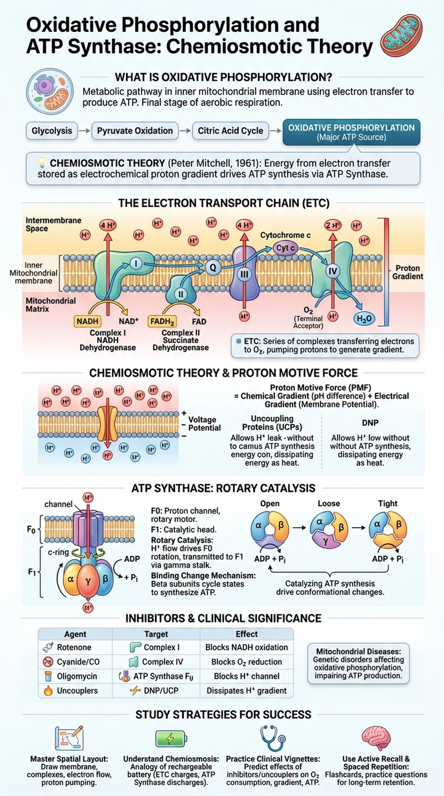 Understanding oxidative phosphorylation is essential for students of biochemistry and medicine because this pathway produces approximately 26 to 28 of the 30 to 32 ATP molecules generated per glucose molecule during complete aerobic respiration. Defects in any component of the system can lead to severe mitochondrial diseases, neurodegeneration, and metabolic failure. The electron transport chain ATP production machinery is therefore one of the most clinically significant biochemical systems in the human body, and a thorough grasp of its mechanism is critical for exams like the MCAT and USMLE.