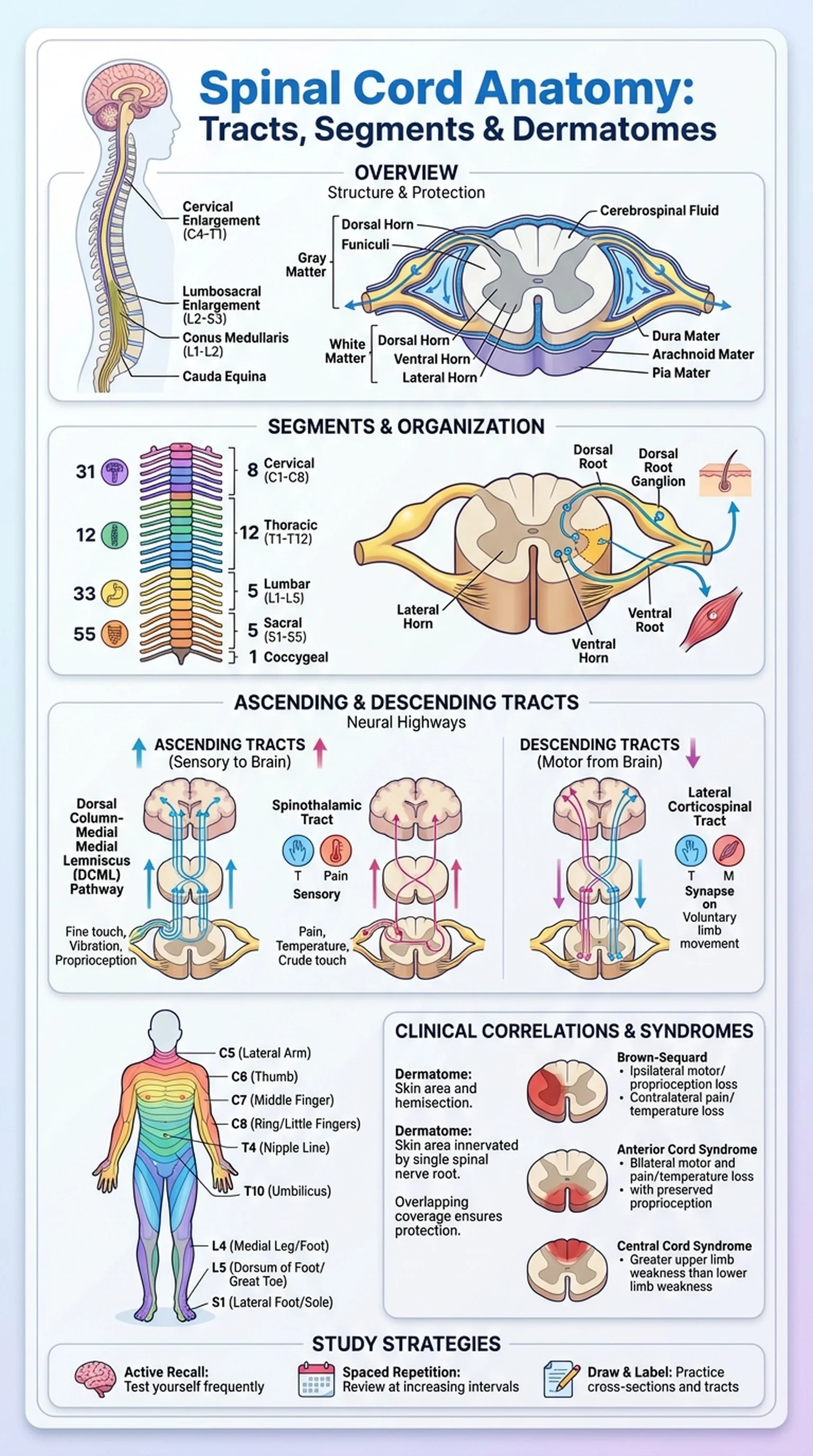 Spinal cord anatomy is one of the most clinically relevant topics in the study of the human nervous system. The spinal cord is a long, cylindrical structure of nervous tissue that extends from the brainstem at the foramen magnum to approximately the level of the first or second lumbar vertebra (L1-L2), where it terminates as the conus medullaris. Below this point, the spinal nerves continue as a bundle called the cauda equina. Understanding spinal cord anatomy is essential for diagnosing and localizing neurological injuries, interpreting imaging studies, and predicting functional deficits after trauma.