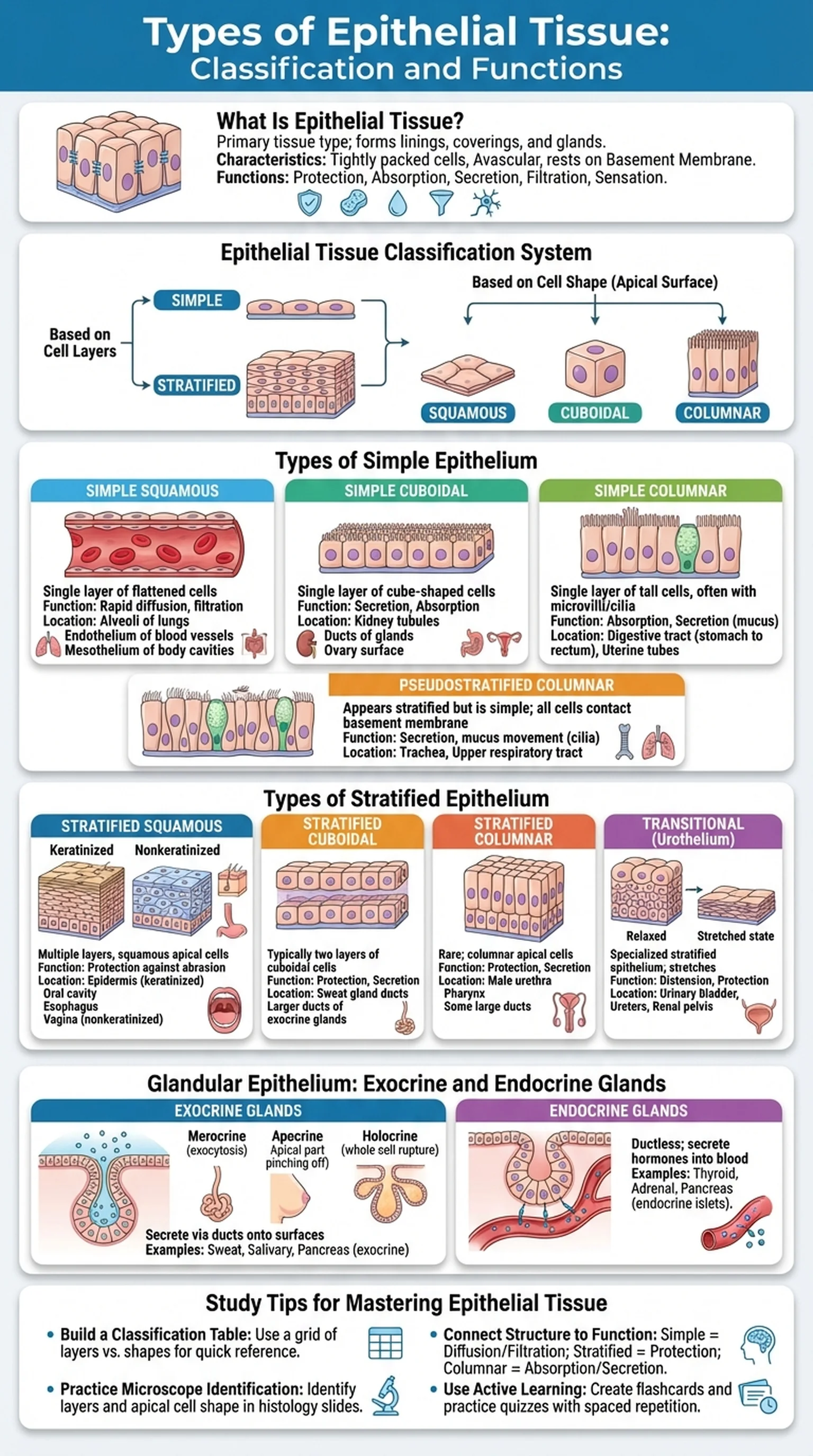 Epithelial tissue performs a wide range of functions depending on its location: protection against mechanical abrasion, pathogens, and chemical damage; absorption of nutrients and ions; secretion of mucus, hormones, and enzymes; filtration of blood in the kidneys; and sensation through specialized neuroepithelial cells. The epithelial tissue classification system organizes these diverse tissues based on two criteria: the number of cell layers and the shape of the cells at the free (apical) surface. This dual classification scheme produces the major types of epithelium that every anatomy student must master.