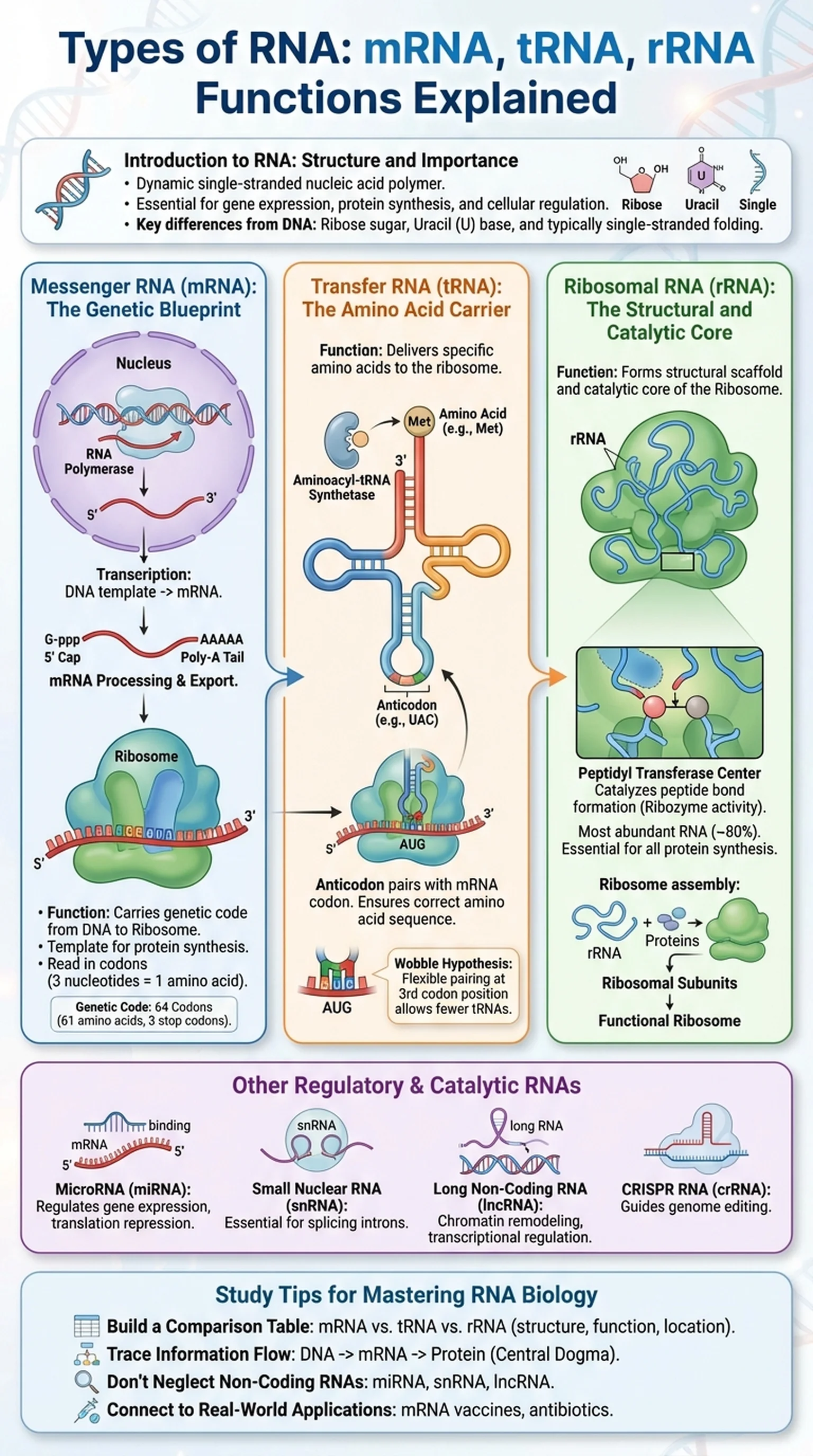 The three major types of RNA involved in protein synthesis are messenger RNA (mRNA), transfer RNA (tRNA), and ribosomal RNA (rRNA). Each performs a distinct RNA function that is indispensable for translating the genetic code into polypeptide chains. Messenger RNA carries the genetic blueprint from DNA to the ribosome. Transfer RNA delivers amino acids to the ribosome in the correct sequence. Ribosomal RNA forms the structural and catalytic core of the ribosome itself. Together, these three types of RNA coordinate the intricate process of translation, and understanding how they work individually and cooperatively is fundamental to mastering molecular biology.